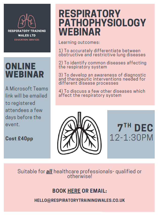 Home Events Event Calendar Respiratory Training Wales, Respiratory Pathophysiology Webinar Respiratory Training Wales, Respiratory Pathophysiology Webinar Date7 Dec 2026 12:00PM – 1:30PMLocationOnlineOrganiserCharlie Earle Download Event to Calendar Event Details 10% off for ARTP Members & those on the ARTP Spirometry Register Quote your ARTP Membership or Spirometry Certificate number when booking To book please email at hello@respiratorytrainingwales.co.uk ensuring you quote your ARTP Membership number for the discount. Please note this training is not endorsed by ARTP and is provided by an external company Organised by: Charlie Earle of Respiratory Training Wales ← Other events Please log in to view your event registrations and bookings.