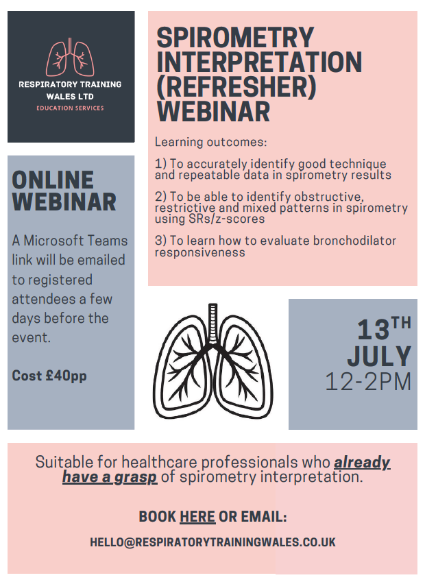 Home Events Event Calendar Respiratory Training Wales, Spirometry Interpretation (Refresher) Webinar Respiratory Training Wales, Spirometry Interpretation (Refresher) Webinar Date13 Jul 2026 12:00PM – 2:00PMLocationOnlineOrganiserCharlie Earle Download Event to Calendar Event Details 10% off for ARTP Members & those on the ARTP Spirometry Register Quote your ARTP Membership or Spirometry Certificate number when booking To book please email at hello@respiratorytrainingwales.co.uk ensuring you quote your ARTP Membership number for the discount. Please note this training is not endorsed by ARTP and is provided by an external company Organised by: Charlie Earle of Respiratory Training Wales ← Other events Please log in to view your event registrations and bookings.