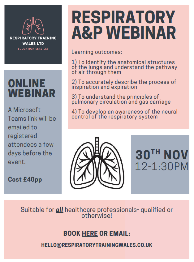 Home Events Event Calendar Respiratory Training Wales, Respiratory A&P Webinar Respiratory Training Wales, Respiratory A&P Webinar Date30 Nov 2026 12:00PM – 1:30PMLocationOnlineOrganiserCharlie Earle Download Event to Calendar Event Details 10% off for ARTP Members & those on the ARTP Spirometry Register Quote your ARTP Membership or Spirometry Certificate number when booking To book please email at hello@respiratorytrainingwales.co.uk ensuring you quote your ARTP Membership number for the discount. Please note this training is not endorsed by ARTP and is provided by an external company Organised by: Charlie Earle of Respiratory Training Wales ← Other events Please log in to view your event registrations and bookings.