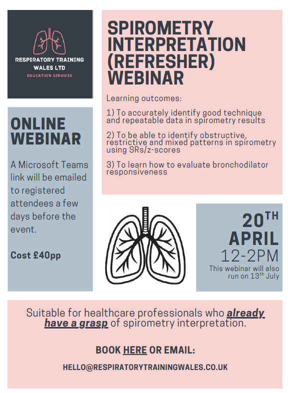 Home Events Event Calendar Respiratory Training Wales, Spirometry Interpretation Webinar Respiratory Training Wales, Spirometry Interpretation Webinar Date20 Apr 2026 12:00PM – 2:00PMLocationOnlineOrganiserCharlie Earle Download Event to Calendar Event Details 10% off for ARTP Members & those on the ARTP Spirometry Register Quote your ARTP Membership or Spirometry Certificate number when booking To book please email at hello@respiratorytrainingwales.co.uk ensuring you quote your ARTP Membership number for the discount. Please note this training is not endorsed by ARTP and is provided by an external company Organised by: Charlie Earle of Respiratory Training Wales ← Other events Please log in to view your event registrations and bookings.