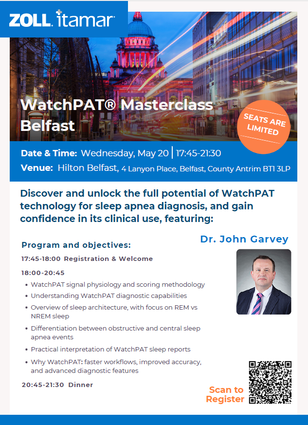 Home Events Event Calendar WatchPAT® Masterclass Belfast WatchPAT® Masterclass Belfast Date20 May 2026LocationHilton Belfast, 4 Lanyon Place, Belfast, County Antrim, BT1 3LPOrganiserZoll Itamar Book online for this event Download Event to Calendar Event Details Directions Cost: Free but registration is required Further details about this event Book online for this event Organised by: Zoll Itamar of Zoll Itamar ← Other events Please log in to view your event registrations and bookings.