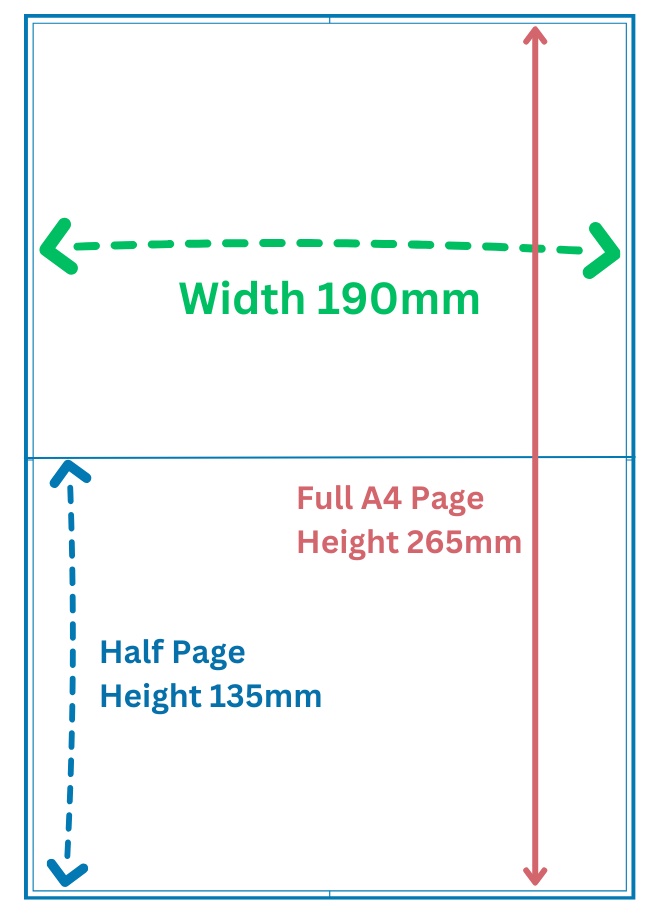 - a half page horizontal advert will be 190mm wide x 135mm tall